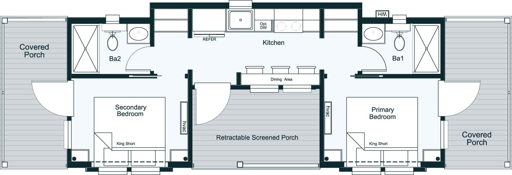 The Kinlock is the perfect house for couples traveling together. This house has two king beds and two full baths. Each bedroom has its own private porch and entry off each end. Off the front is a recessed front porch that is protected by a Retractable screen. The gas strut window over the kitchen countertop opens up, creating an indoor and outdoor living space that is perfect for dining or having conversations on the bar stools, porch side.  Starting at $150,000.  (Pricing includes delivery, setup, and sales tax)